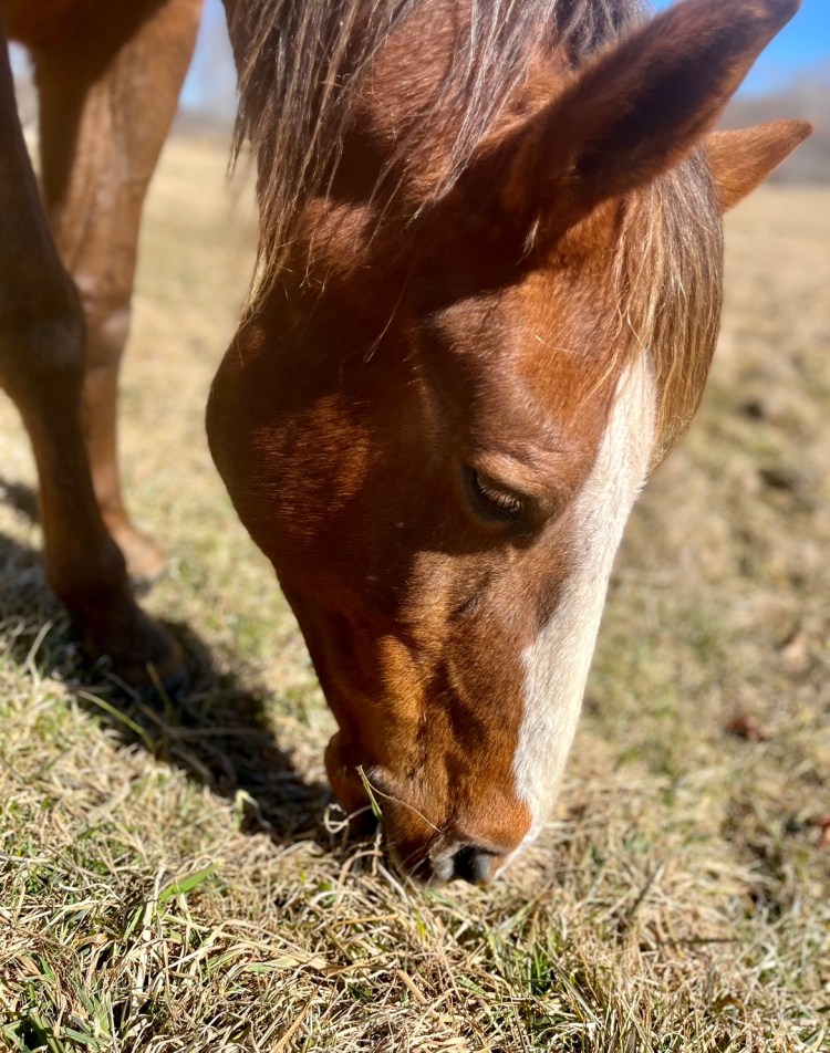 She has been home three months and it’s a long road but she is improving. She came home after many sessions of osteopathic body work done slowly as her body could handle it, and many blood tests and radiographs to rule out diseases and injury, and ended up needing a dental adjustment to release pressure in her sinus cavity that was causing a constant low grade abscess. Right now her body is in much better shape except chest area is still holding deep hard tension —- gradually I see it releasing. When I began to do some of the Masterson work with her I was a bit surprised to find so much releasing around her hind end and less in the neck/shoulders. But she did seem to enjoy the process and even stopped eating grass to participate. She gave many release moments and I could see a change in her movement later that day when she trotted around the field with the herd in a more relaxed gait. She is also walking more fluidly as I do this work on her little by little.