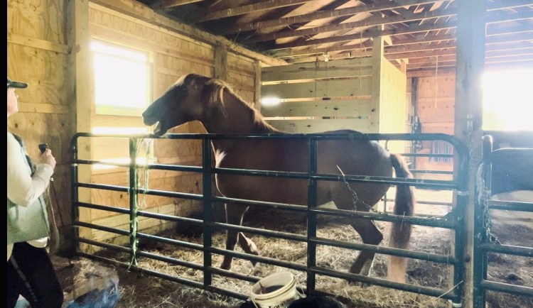 Day one and day two were spent with Tom sorting out the fact that Wyoming is not only complicated, but that she does not feel good most of the time. Even in the herd she is never fully relaxed, she is the one who appears to take on the role of defender of any possible harm. This is a heavy load to carry. Any new environmental stimuli, even a chainsaw a mile away in the woods across the street is cause for concern and alert.