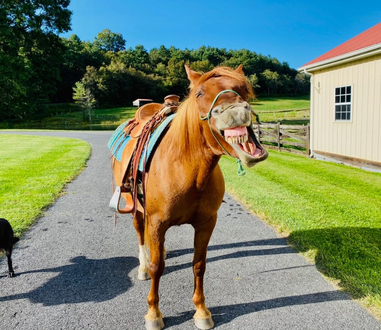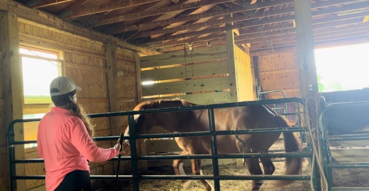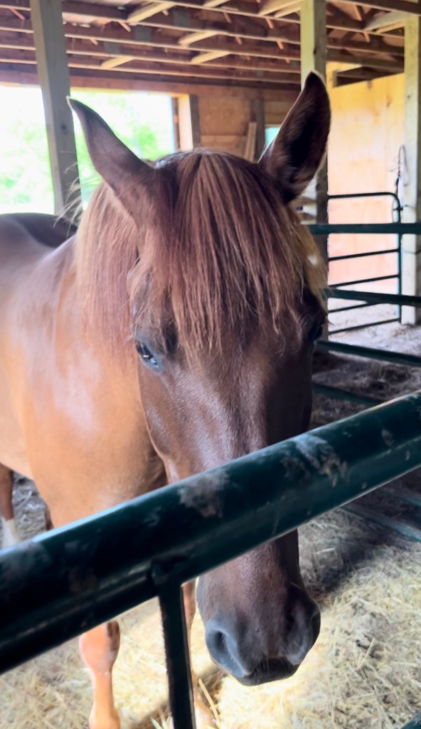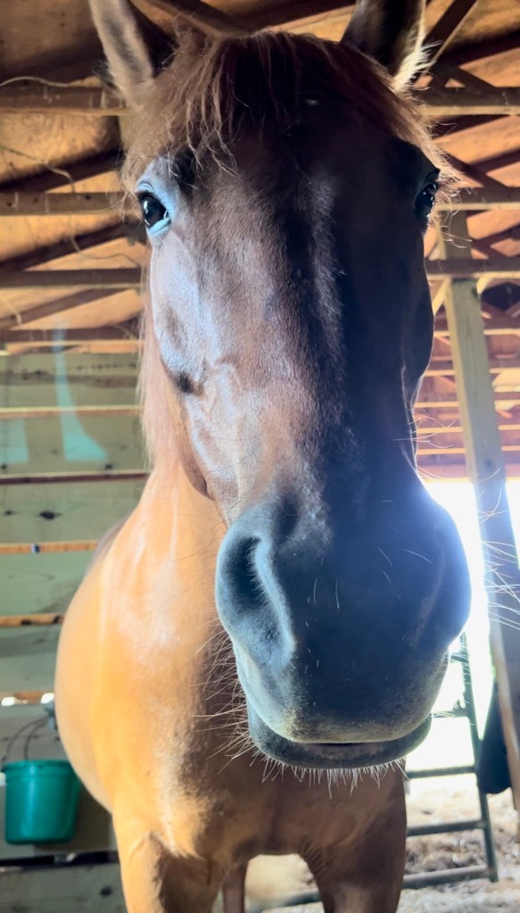 When I walk into Wyoming’s stall she immediately comes to meet me at the gate. I offer the halter and she will grudgingly allow it to be pulled up over her nose. Gradients of messy depending on the day, but I get it done.
