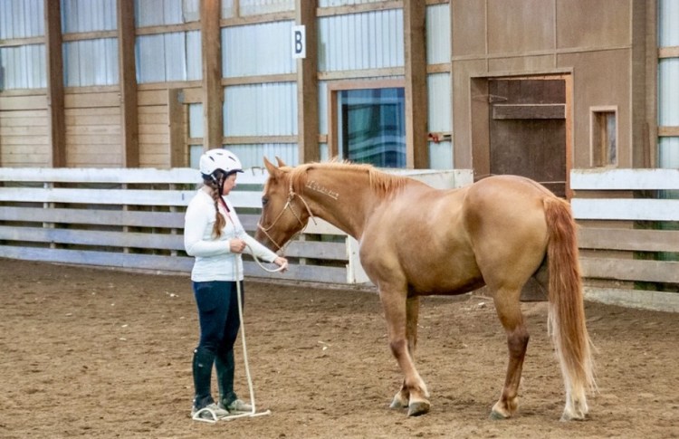 It’s likely with the trainer’s natural horsemanship approach: round pen, energy work and driving to create draw, the mare could be successful and avoid having the feel of restriction of the halter on her head. She became an amazing energy and body language reader. She became a punishment avoiding release hunter. When we picked her up as total strangers, just walking into the small arena, she would hook on to us or whomever it was, and follow closely. It didn’t occur to me that so much draw had been created in this mare that she felt the only good place to be was next to a human in order to avoid being sent out and driven.