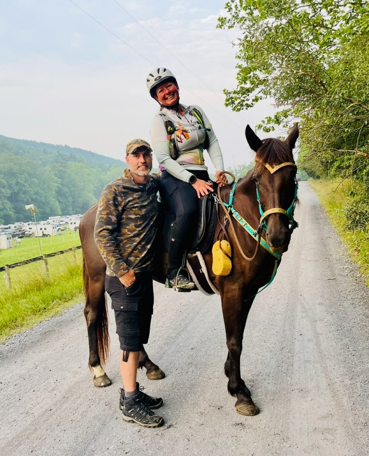 I might have noticed some warning bells when ride morning was so unusually warm and humid. The last time I was at this ride it was in the 40s at the start! I noticed within a mile that Khaleesi was not her usual “on fire” self. I knew she wanted to run with the pack, but she felt heavy and clearly unable to fly up the mountains like she has in years past. We were riding through thick humid air from the starting line, and her lack of energy concerned me from very early on.